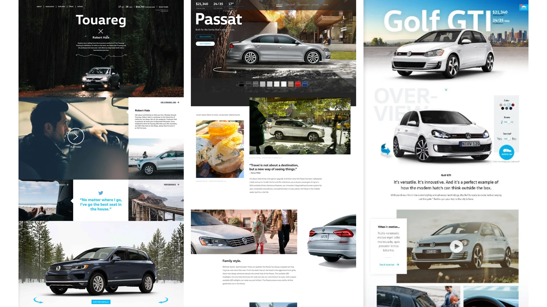 In the summer of 2015, we made a proposal to our Volkswagen clients: VW.com was beginning to fall behind the industry, and the most important pages were not working to their fullest potential. Competitive brands used people, photography, and video to sell a lifestyle. Most images on VW.com were computer generated, interactive and video content was next to non-existent, and important information was frequently hidden within carousels to save space. We knew that we needed to bring the Volkswagen brand to life in a way that would help shoppers picture themselves in a VW. And the most highly visited pages were a natural place for Volkswagens to come to life: the Model Bucket Pages.